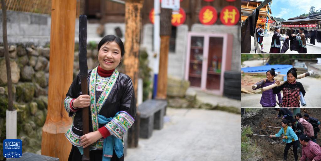 拼版照片:左圖為在廣西融水苗族自治縣桿洞鄉烏英苗寨,40歲的吳妹富站在亮布小廣場(chǎng)上(2023年4月25日攝);右上圖為吳妹富(右)在亮布文化節上展示自己制作的亮布(2020年10月25日攝);右中圖為吳妹富(右)扛著(zhù)亮布槌參加亮布文化節(2020年10月25日攝);右下圖為吳妹富在勞作(2017年11月9日攝)。