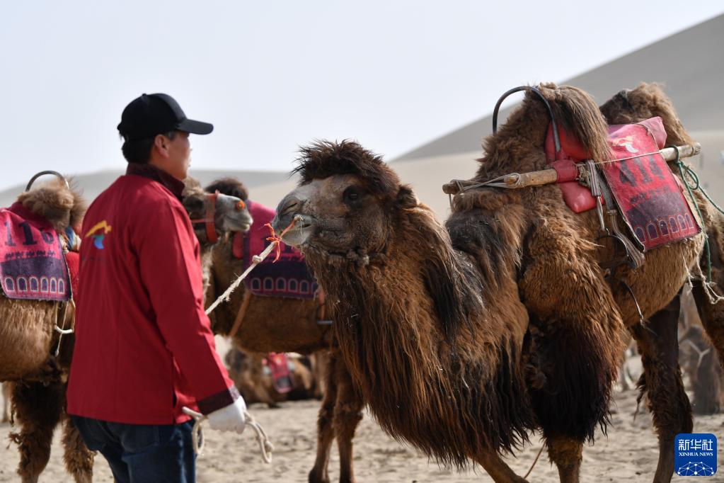 曹文華牽著(zhù)駱駝在鳴沙山月牙泉景區駱駝騎乘點(diǎn)等待游客(4月24日攝)。