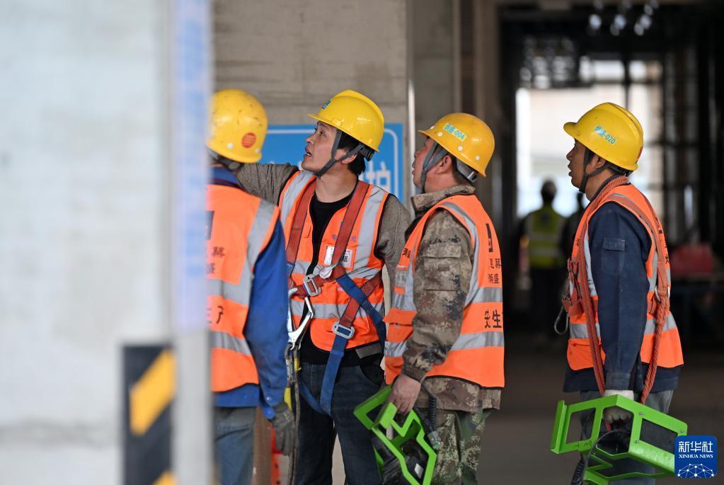 齊國超(左二)在施工現場(chǎng)和工人交流(4月29日攝)。