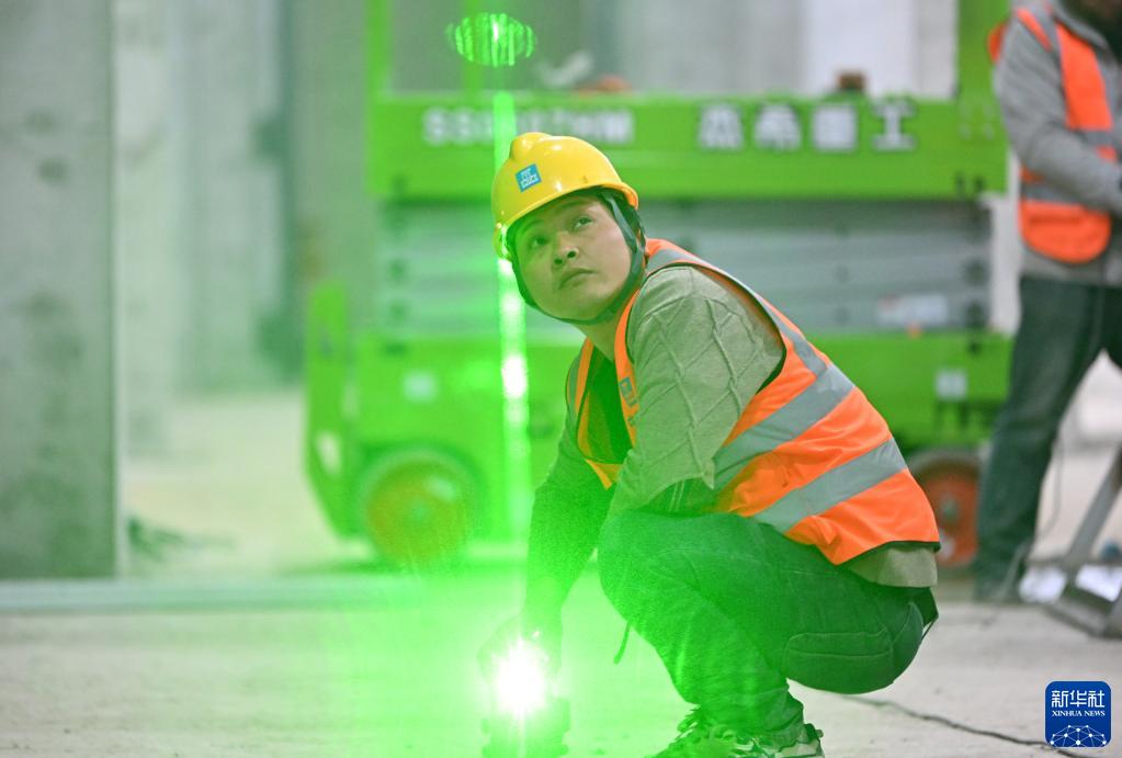 齊國超在施工現場(chǎng)擺放水平儀(4月29日攝)。