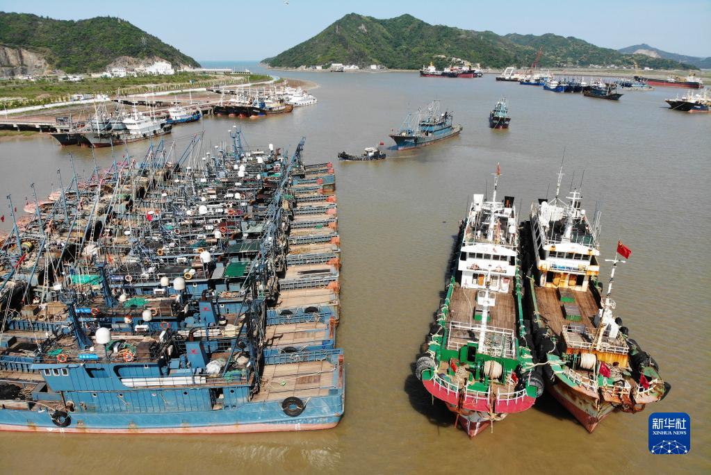 4月30日在浙江省臺州市路橋區金清鎮漁港碼頭拍攝的回港的漁船(無(wú)人機照片)。