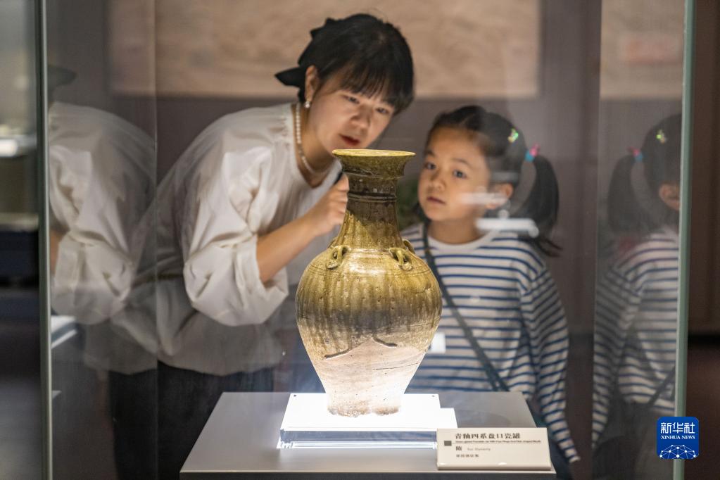 4月29日,參觀(guān)者在安徽省合肥市肥東縣博物館欣賞隋朝青釉四系盤(pán)口瓷罐。