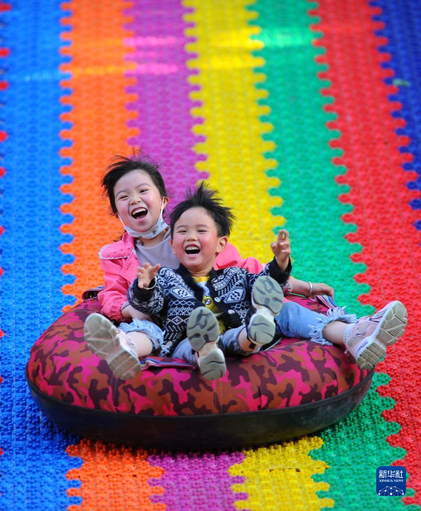4月29日,兩名小朋友在山東省滕州市荊河公園體驗彩虹滑道。