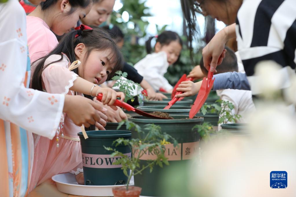 5月1日,在浙江省嘉興市南湖區一家農場(chǎng)里,小朋友體驗移栽番茄苗。