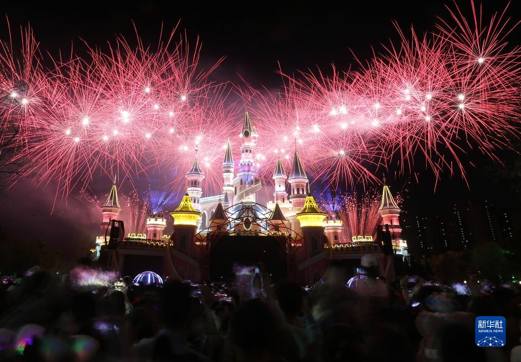 5月1日,游客在沈陽(yáng)方特歡樂(lè )世界觀(guān)賞煙花表演。