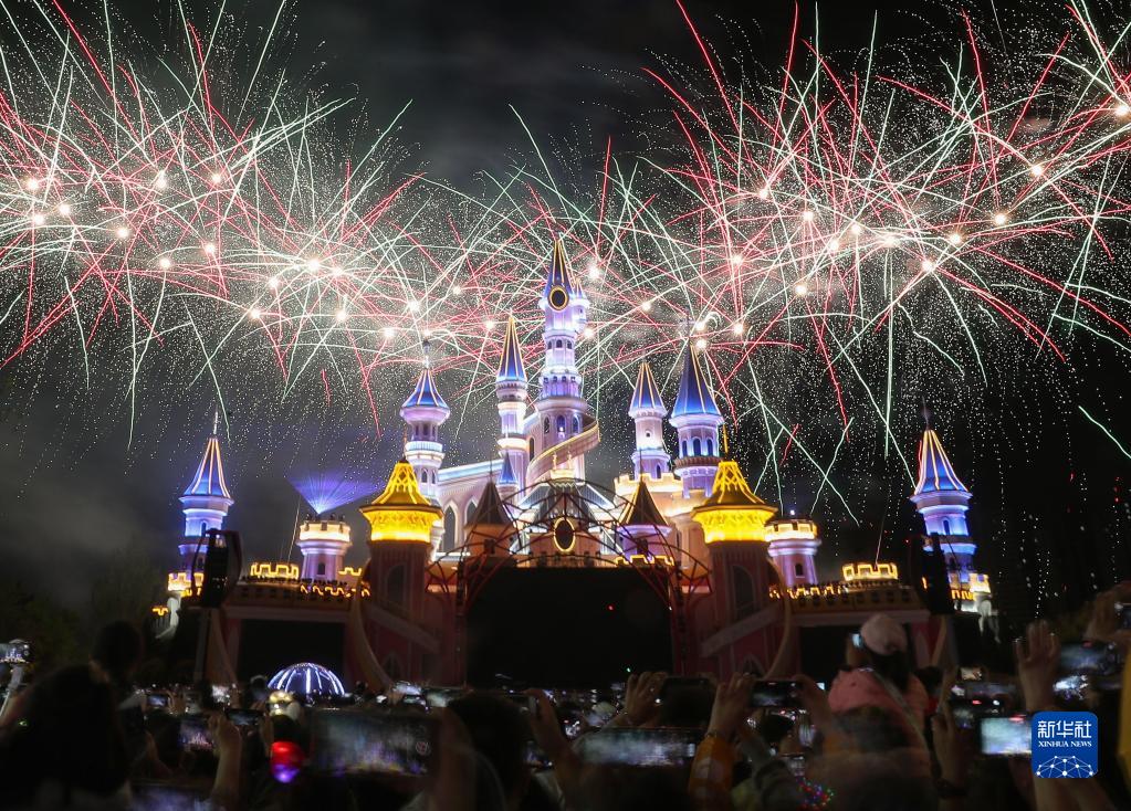 5月1日,游客在沈陽(yáng)方特歡樂(lè )世界觀(guān)賞煙花表演。