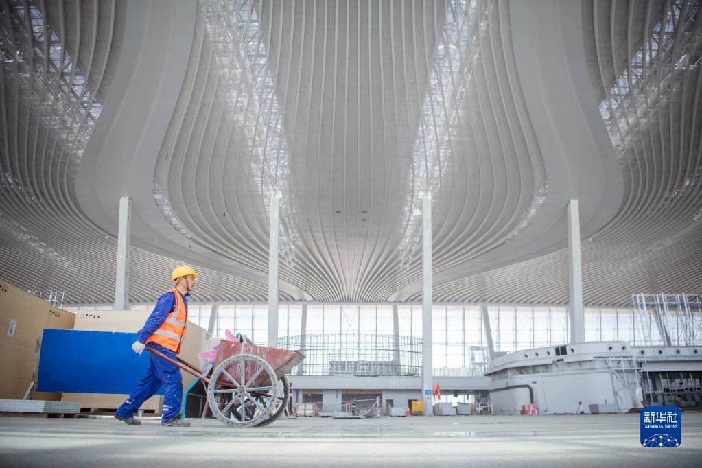5月1日,在中建三局承建的武漢天河機場(chǎng)T2航站樓改造工程項目工地,工人在運輸建筑材料。