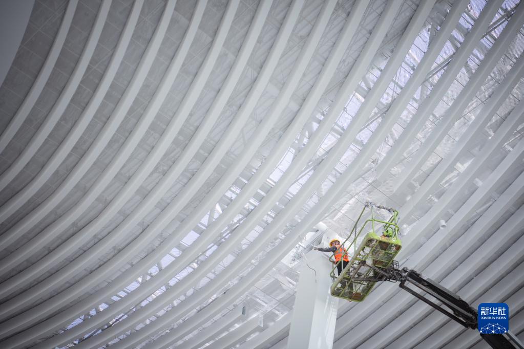5月1日,在中建三局承建的武漢天河機場(chǎng)T2航站樓改造工程項目工地,工人在檢查吊頂內管線(xiàn)。