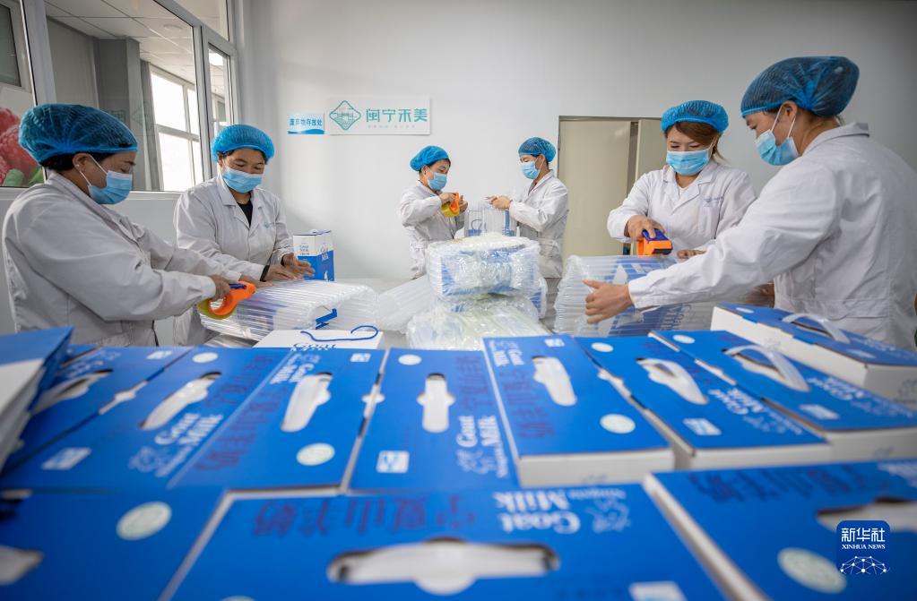 5月1日,在寧夏銀川市永寧縣閩寧鎮禾美電商車(chē)間,工作人員在打包產(chǎn)品。