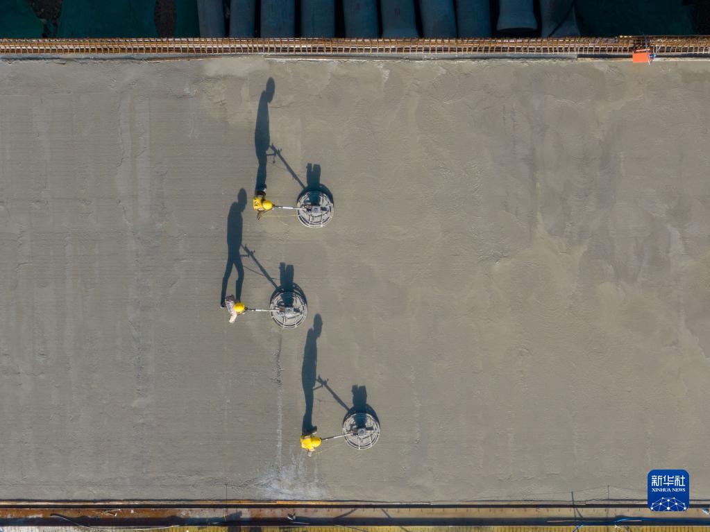 5月1日,工人在安徽省合肥市肥東縣橋頭集路快速化改造建設工地施工(無(wú)人機照片)。