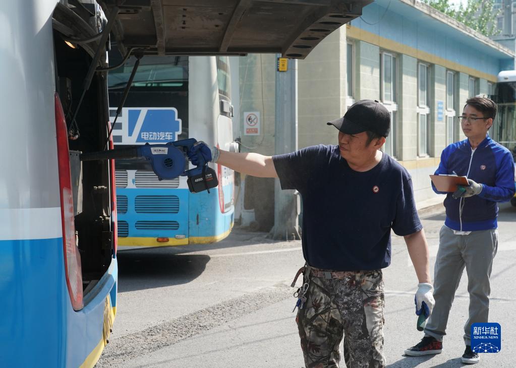 5月1日,在位于北京市朝陽(yáng)區的柳芳公交場(chǎng)站,技術(shù)員劉紅濤(左)在清潔車(chē)輛后機艙。