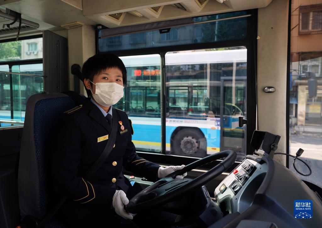 5月1日,在位于北京市朝陽(yáng)區的柳芳公交場(chǎng)站,104路公交車(chē)駕駛員高國然駕駛車(chē)輛準備駛出。