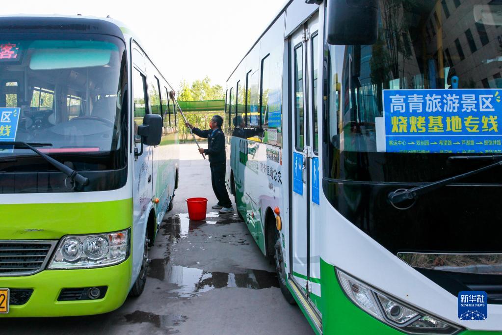 4月29日,在淄博市高青縣客運站,一名司機在保養車(chē)輛。當地推出1元“燒烤公交”專(zhuān)線(xiàn)方便游客出行。