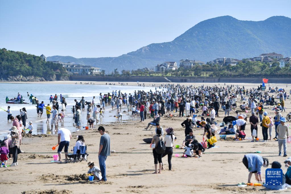 4月30日,游客在浙江舟山朱家尖景區沙灘上嬉戲游玩。