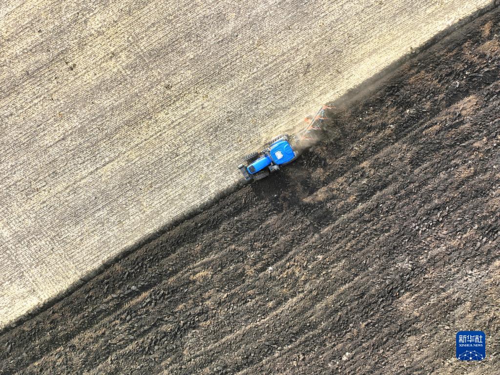 5月1日,河北省承德市豐寧滿(mǎn)族自治縣大灘鎮扎拉營(yíng)村的農民在耕地(無(wú)人機照片)。