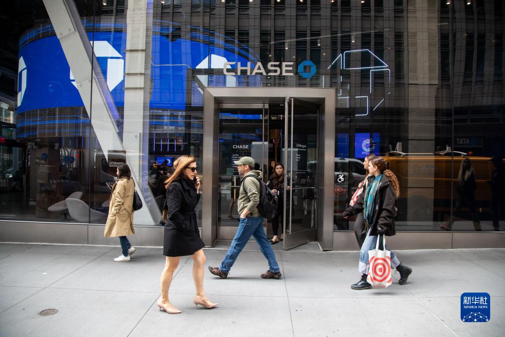 5月1日,在美國紐約,行人從一家摩根大通銀行前走過(guò)。