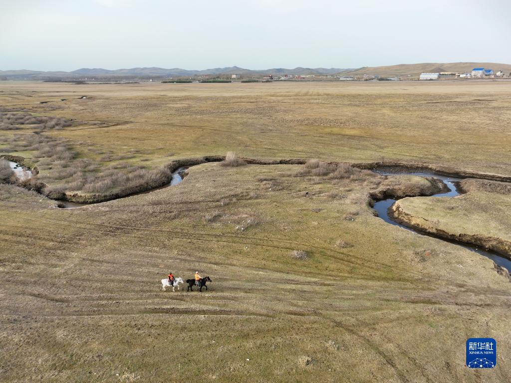 5月2日,河北省承德市豐寧滿(mǎn)族自治縣大灘鎮扎拉營(yíng)村的護林員在海留圖國家濕地公園巡邏(無(wú)人機照片)。