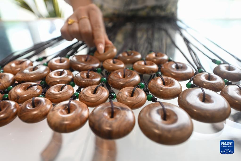 5月1日在海南花梨谷文化旅游區文創(chuàng )中心拍攝的黃花梨文創(chuàng )產(chǎn)品。