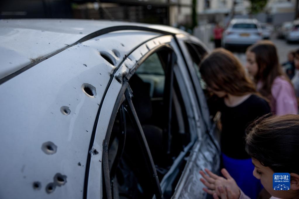 5月2日,在以色列南部城市斯代羅特,人們查看一輛遭火箭彈襲擊的汽車(chē)。