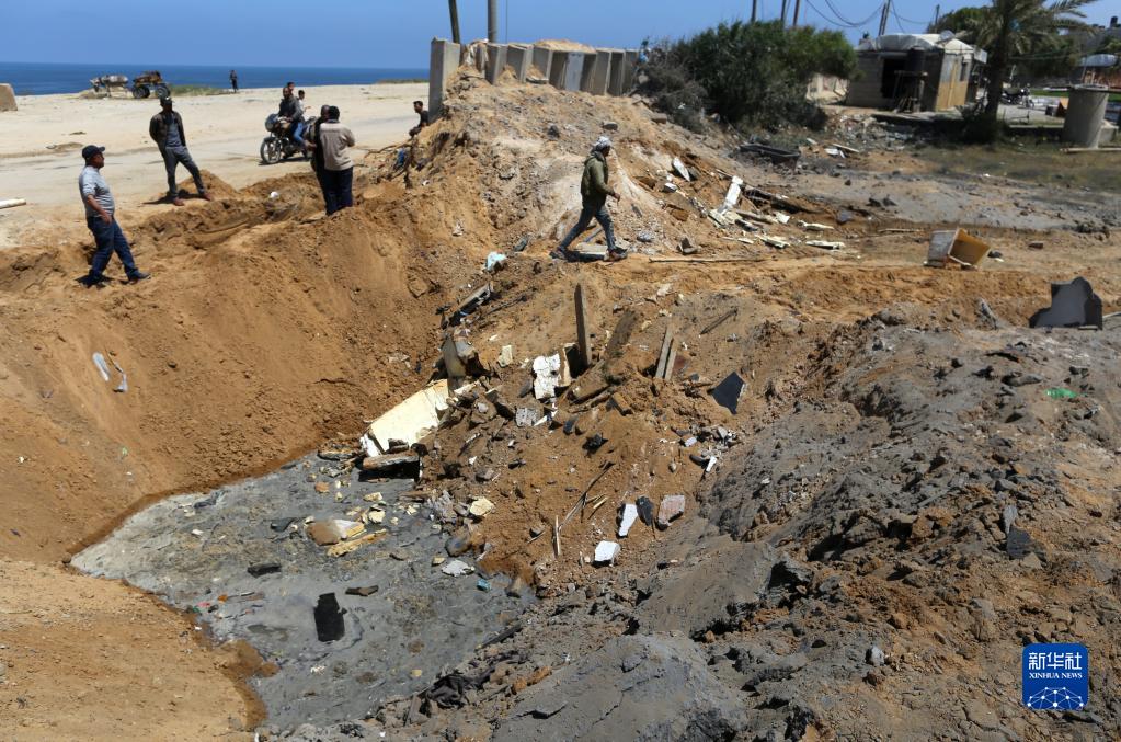 5月3日,人們在加沙地帶城市代爾拜拉赫查看一處以色列軍隊空襲地點(diǎn)。