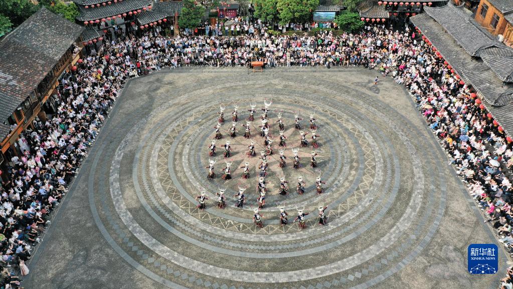 5月2日,游客在貴州省黔東南苗族侗族自治州雷山縣西江千戶(hù)苗寨觀(guān)看民族歌舞表演(無(wú)人機照片)。