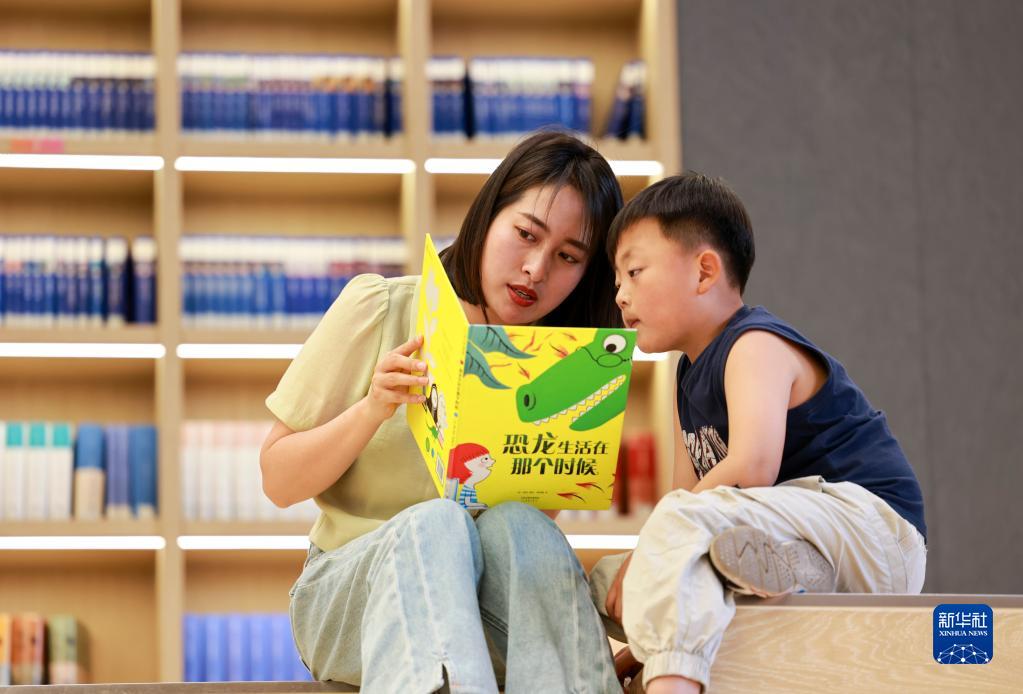 5月2日,一名家長(cháng)帶著(zhù)小朋友在江蘇省泰興市新時(shí)代文明實(shí)踐中心城市書(shū)房閱讀。