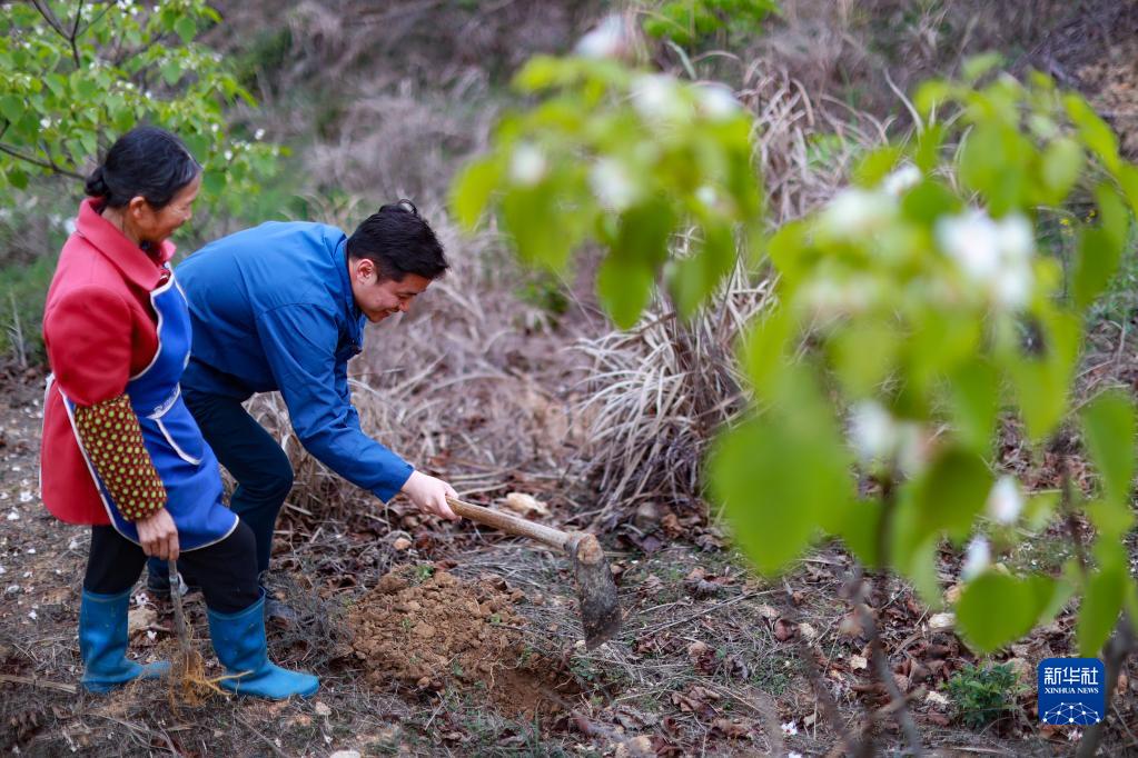 楊安仁(右)和工人一起在油桐種植基地栽種油桐樹(shù)苗(4月17日攝)。