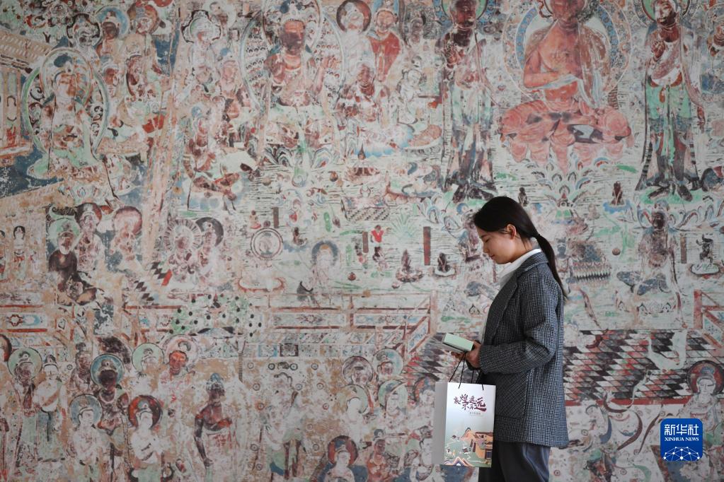 敦煌研究院文物數字化保護團隊創(chuàng )意營(yíng)銷(xiāo)人員廖雪婷從一幅高保真復制壁畫(huà)前走過(guò)(4月25日攝)。