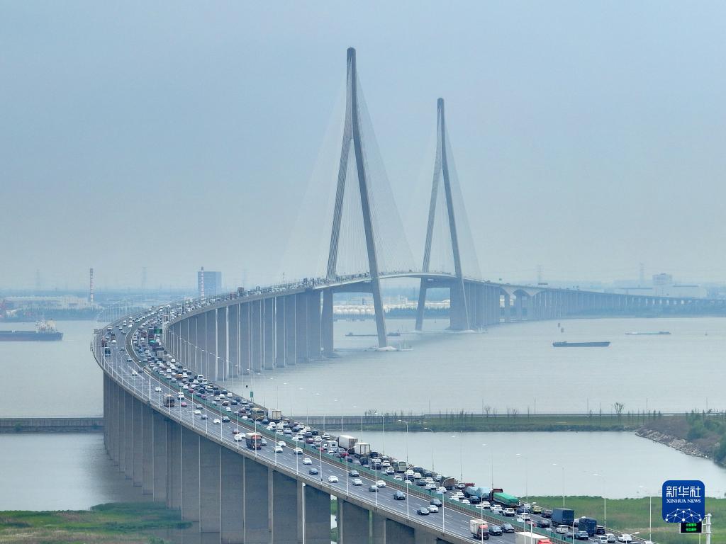 5月3日拍攝的江蘇蘇通大橋上的車(chē)流(無(wú)人機照片)。