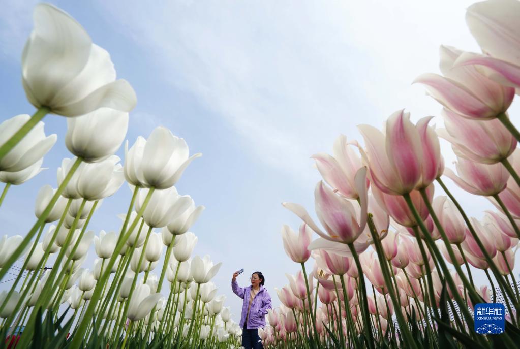 5月3日,游客在河北省灤南縣東黃坨鎮閆莊戶(hù)村郁金香種植基地拍照。