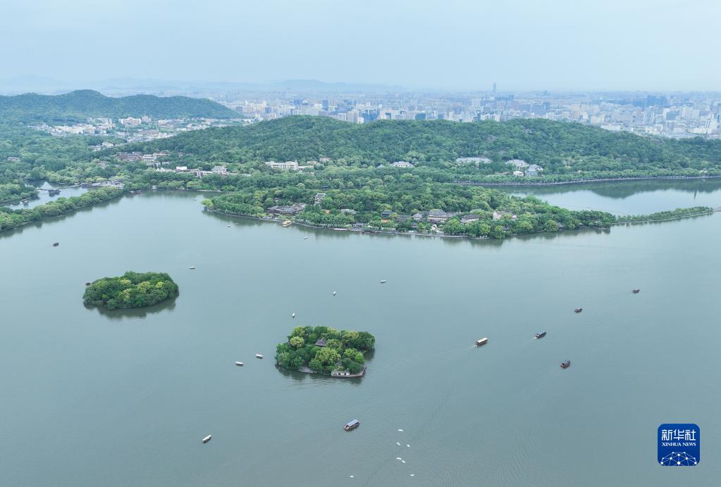 5月3日,游客在杭州西湖乘船游玩(無(wú)人機照片)。