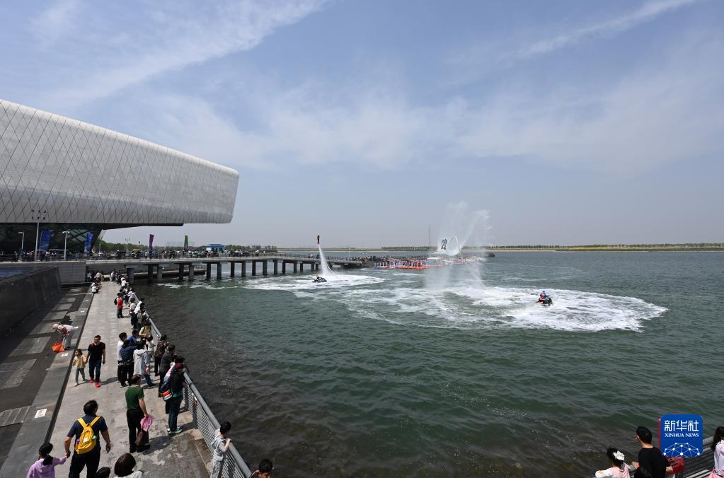 5月3日,游客在位于天津市濱海新區的國家海洋博物館室外觀(guān)看水上特技表演。