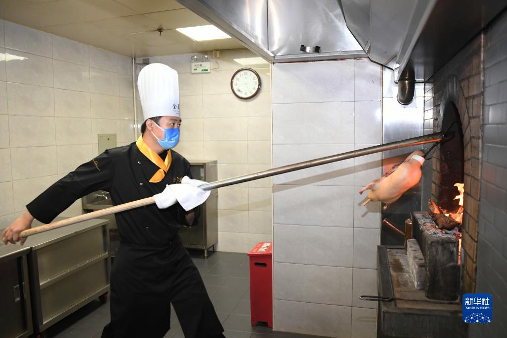 在全聚德王府井店,夏志鵬烤制鴨坯(4月27日攝)。
