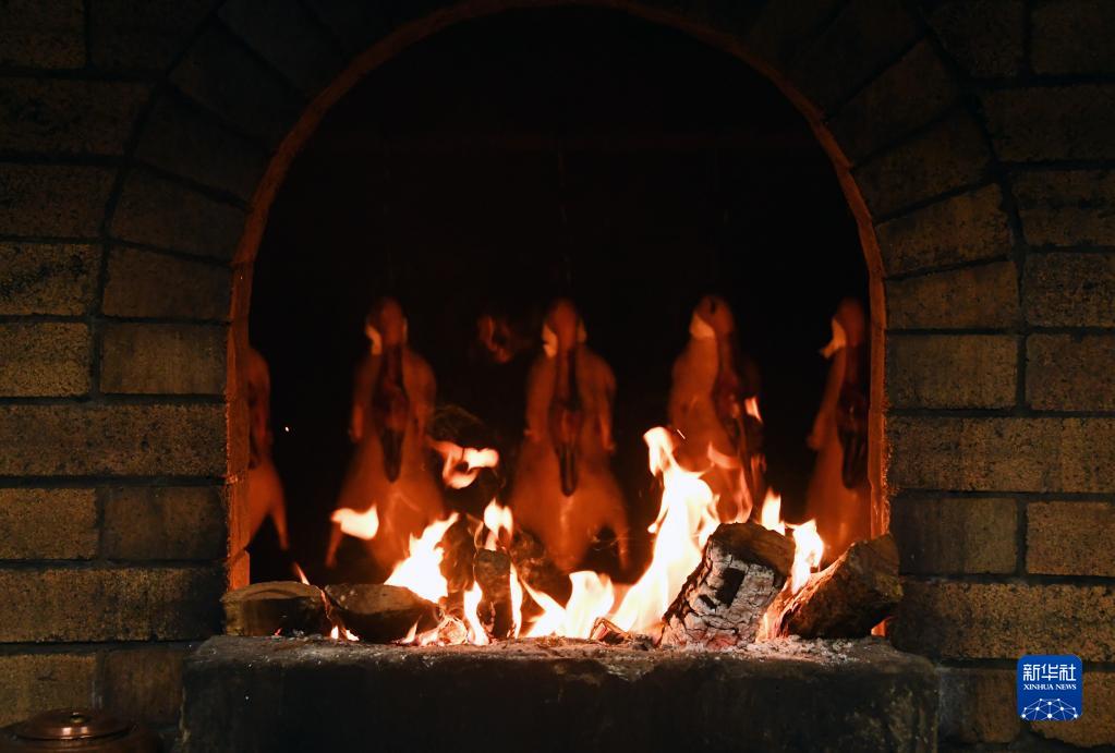 在全聚德王府井店火爐中的鴨坯(4月27日攝)。