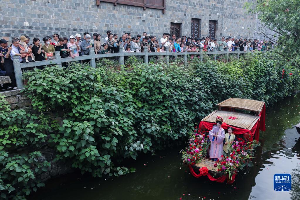 當日,浙江省建德市梅城鎮嚴州古城舉行宋韻水上婚禮表演,通過(guò)出閣、梳妝、登船、親迎、禮拜的五幕演繹,吸引了人們駐足觀(guān)禮。有著(zhù)1000多年歷史的嚴州古城地處新安江、富春江、蘭江交匯處,歷史文化積淀深厚。