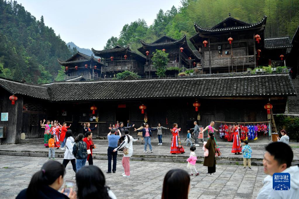 5月3日,在湖北省宣恩縣彭家寨古吊腳樓前,游客與村民同跳土家“擺手舞”。