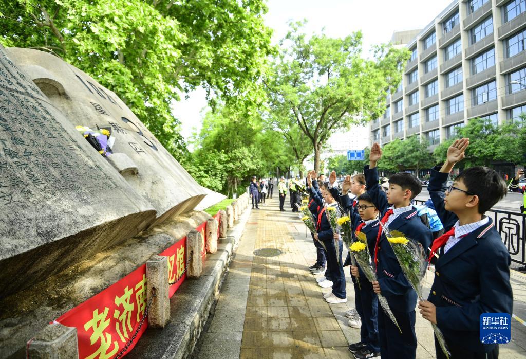 5月3日,小學(xué)生在“五三慘案”紀念碑前悼念。