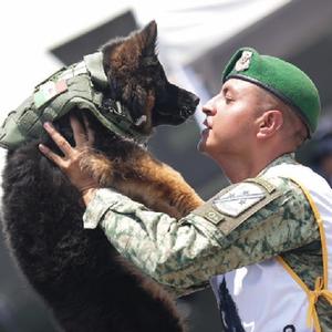 5月3日,在墨西哥瑙卡爾潘一處軍事基地,訓導員抱著(zhù)土耳其贈送的小狗。