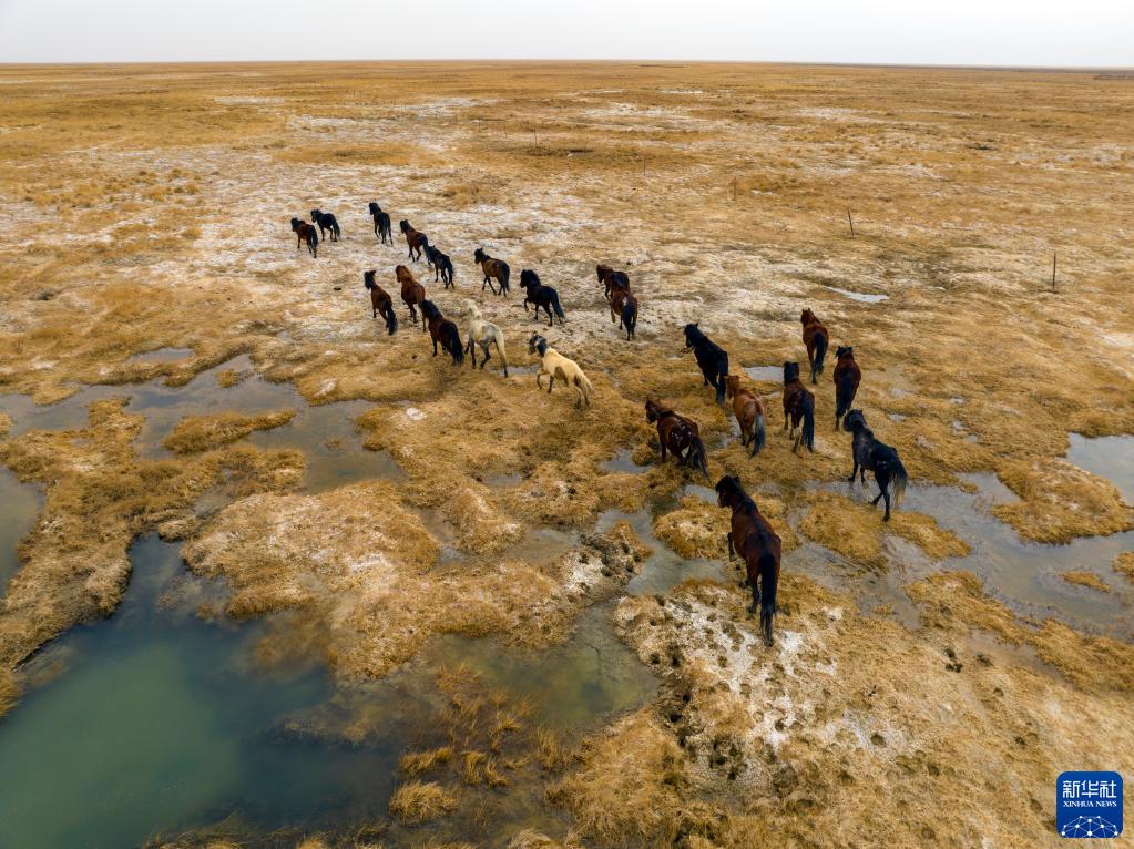 5月3日,在阿克塞縣阿伊納鄉海子草原,馬群轉場(chǎng)去往夏季牧場(chǎng)(無(wú)人機照片)。