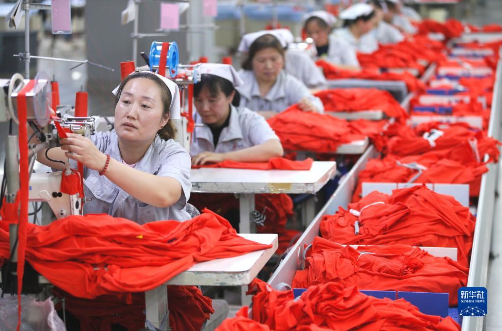 5月4日,在山東省青島市即墨區一家服裝企業(yè),工人生產(chǎn)出口到海外市場(chǎng)的服裝。