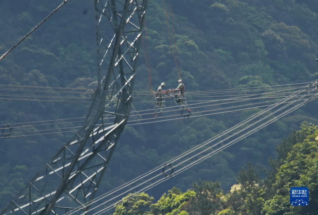 5月4日,在福建省寧德市洪口鄉,國網(wǎng)福建超高壓公司帶電班檢修工周曉剛(右)對輸電線(xiàn)路進(jìn)行帶電作業(yè)。