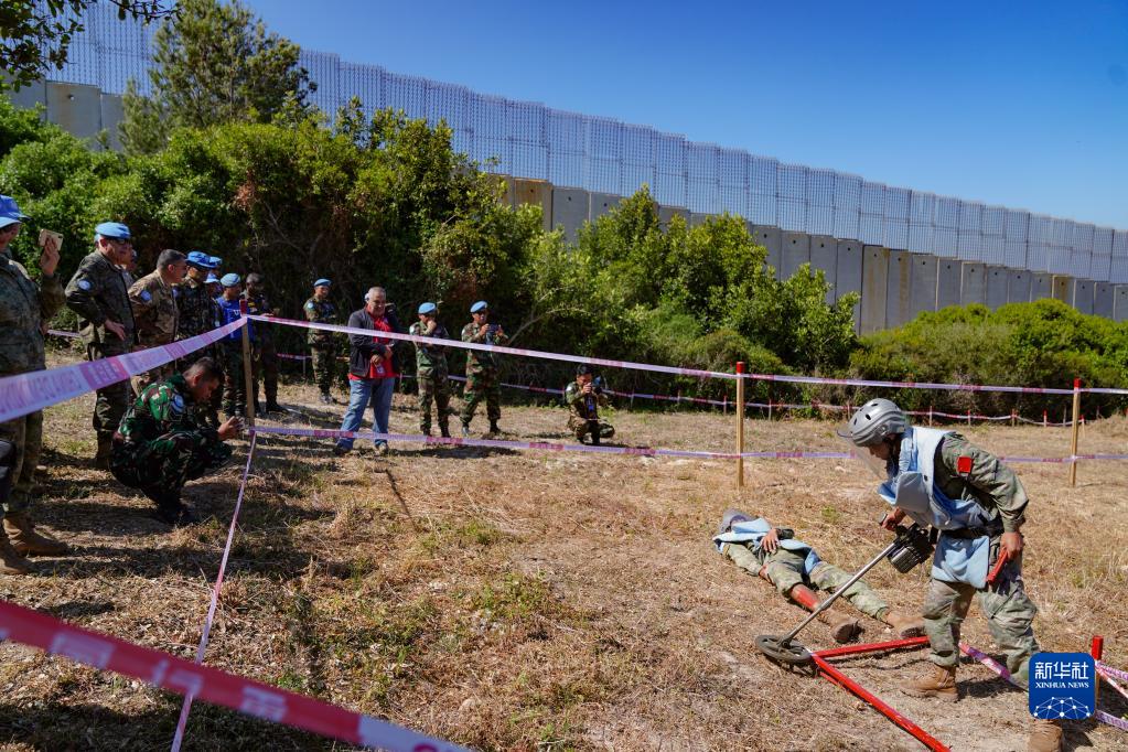 5月3日,在黎巴嫩南部邊境“藍線(xiàn)”附近雷場(chǎng),參與演習的中國第21批赴黎巴嫩維和多功能工兵分隊掃雷作業(yè)手開(kāi)辟救援通道。新華社發(fā)(李竹林攝)