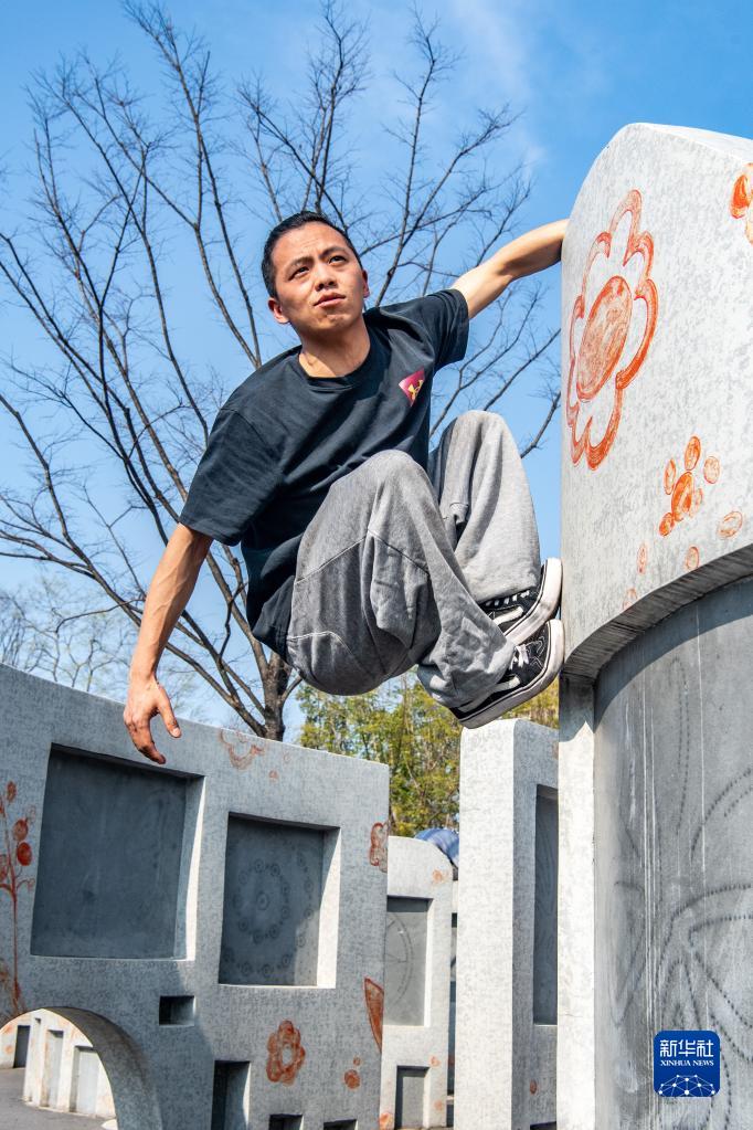 2023年3月14日,重慶躍飛跑酷隊員文舜堯在重慶金州公園拍攝跑酷視頻。
