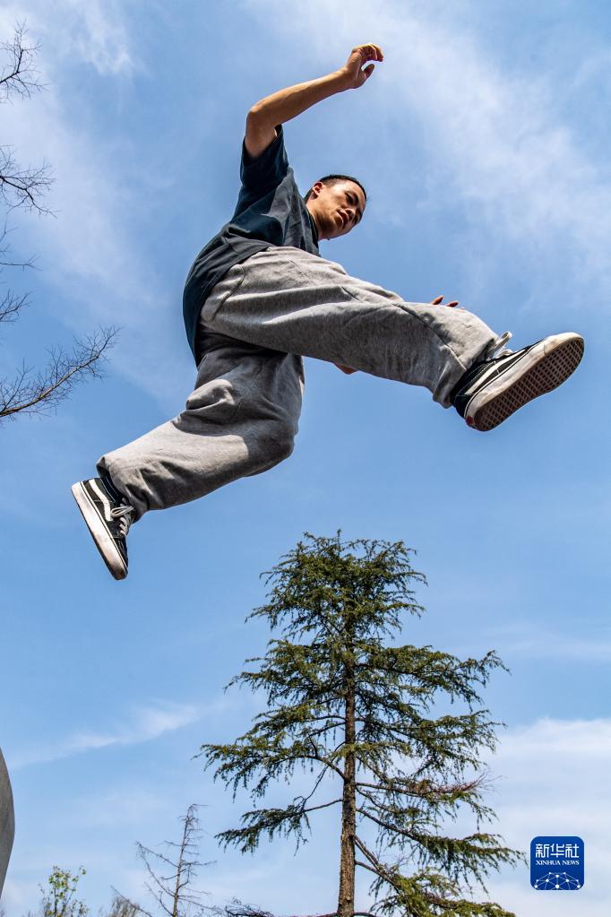 2023年3月14日,重慶躍飛跑酷隊員文舜堯在重慶金州公園嘗試新設計的跑酷路線(xiàn)。
