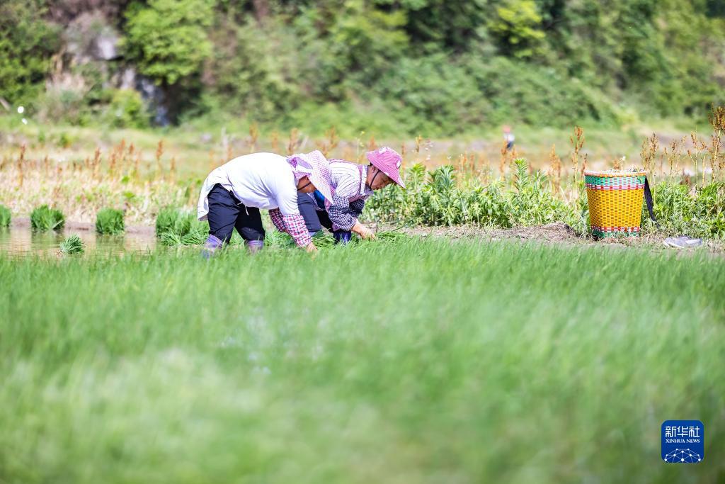 5月5日,農民在貴州省安順市西秀區雞場(chǎng)布依族苗族鄉石井村田間插秧。