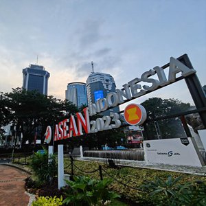 5月5日,在印度尼西亞首都雅加達,人們經(jīng)過(guò)街頭的一處2023年?yáng)|盟峰會(huì )標志(手機照片)。