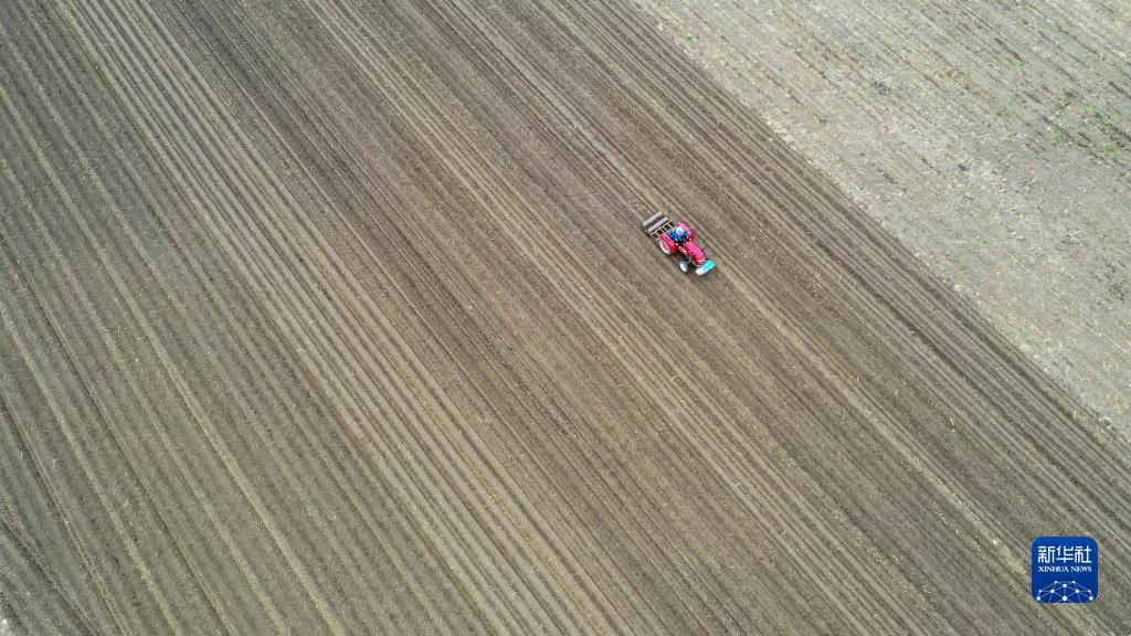 5月5日,在吉林省長(cháng)春市九臺區龍嘉街道水鄉村,農民駕駛農機進(jìn)行春耕作業(yè)(無(wú)人機照片)。
