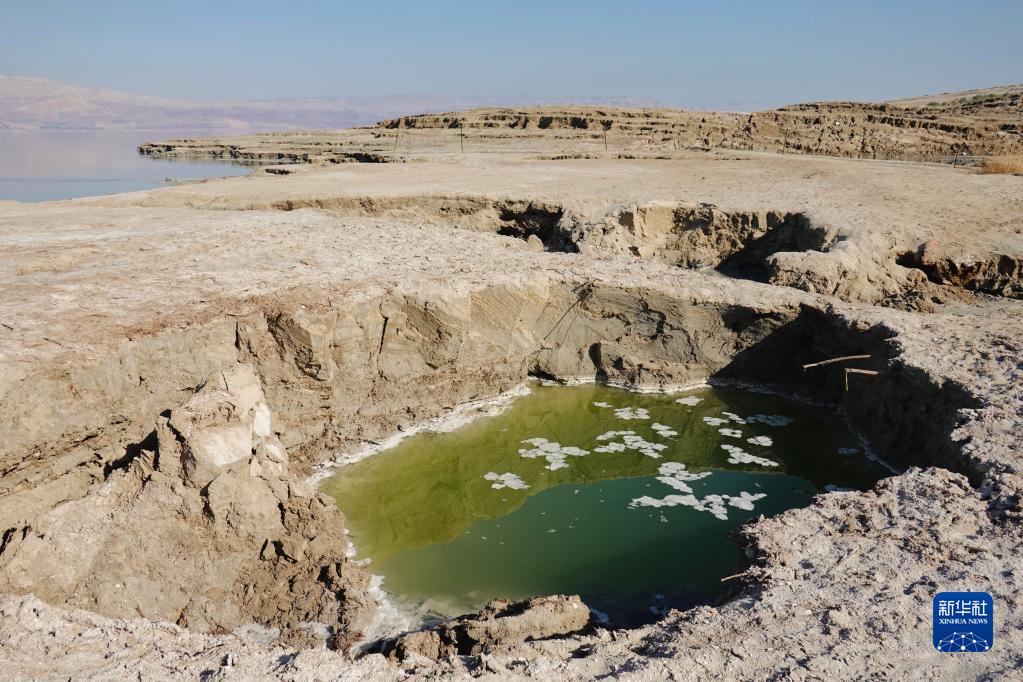據報道,死海水位每年平均下降大約1.2米。隨著(zhù)水面縮減,海岸線(xiàn)不斷后退,原來(lái)有水處形成的鹽塊在地下水的沖刷下消失,地表出現一個(gè)個(gè)大型窟窿,即天坑。