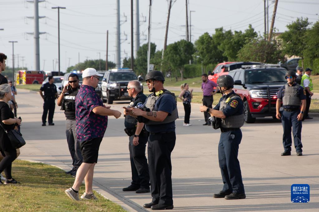 5月6日,警察在美國得克薩斯州達拉斯近郊發(fā)生槍擊事件的購物中心附近和目擊者交談。