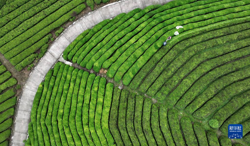 5月7日,茶農在鶴峰縣走馬鎮楊柳池茶園采茶(無(wú)人機照片)。